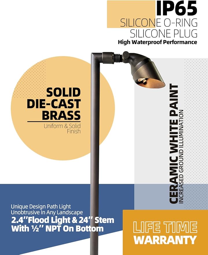 - OPTIMAL ILLUMINATION:Adjustable cast brass knuckle with thumb screw path light looks beautiful yet unobtrusive in any landscape. 2.4" flood light supports a vertical rotation of 180 degrees, 24" high stem for this path light, can projects 5-foot diameter region of illumination. Ceramic white paint underneath shade for increased ground illumination