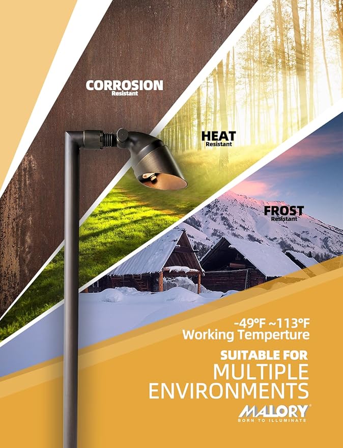 - BRASS PATH LIGHT: The stem and light cap for this path light is constructed of die-cast brass for durability and beauty. IP65 waterproof rating and -49℉⁓113℉ working temperture,suitable for any outdoor environment use,without worrying about rain, snow, frost, high temperature, and other bad weather.