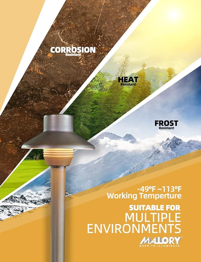 - BRASS PATH LIGHT: The stem and light cap for this path light is constructed of die-cast brass for durability and beauty. IP65 waterproof rating and -49℉⁓113℉ working temperture,suitable for any outdoor environment use,without worrying about rain, snow, frost, high temperature, and other bad weather.