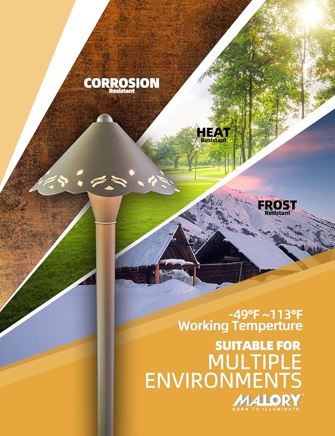 - BRASS PATH LIGHT: The stem and light cat for this path light is constructed of die-cast brass for durability and beauty. IP65 waterproof rating and -49℉⁓113℉ working temperture,suitable for any outdoor environment use,without worrying about rain, snow, frost, high temperature, and other bad weather.