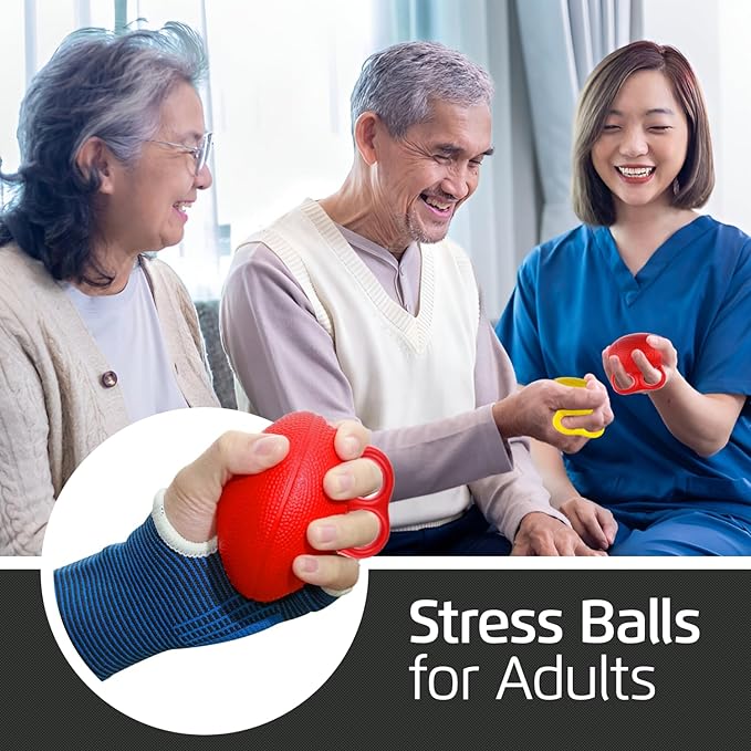 - 3-Piece Set: Ideal for building up hand, finger and wrist strength, this stress balls for adults therapy set includes 3 color-coded resistance levels – yellow (light for beginners), blue (medium for intermediate) and red (heavy for advanced users) – so you can advance at your own pace.