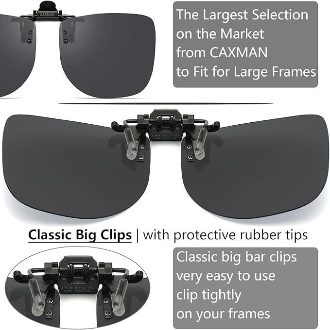 - Big Clips w/ a Balance Bar to Achieve a Snugly Fit for Your Frames - the classic clips mechanism part is the most practical design with the large balance bar to make sure these can fit easily and snugly on your frames; rubber cap covers the feet to protect your lens