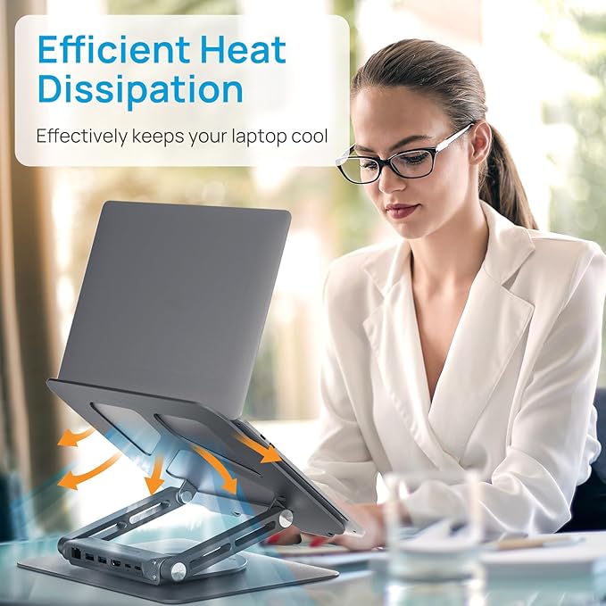 - ♥ 360°Rotation & Ergonomic -- Featuring a 360° rotatable axis connecting with the base, this laptop stand for desk allows you to swivel your laptop to any angle. USB C laptop docking stand elevates your laptop to your eye level to fix your posture and reduce your neck and back stiffness