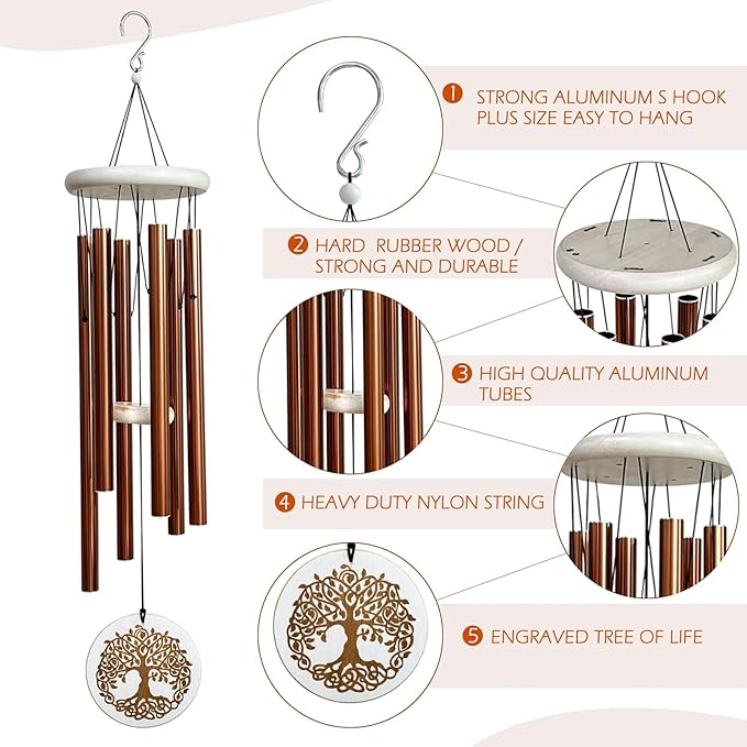 - ♪【Large Outdoor Wind Chimes】33 inch in total length tree of life wind chimes. 6 metal tubes are hand-tuned by our professional tuning experts to achieve a superior musical performance.Heavy duty nylon cording high density wood striker for a clear tone and resonances. Thick tubing wall creates a longer lasting deep tone.The sound is soft,deep tone and relaxing,can bring you auditory enjoyment!.