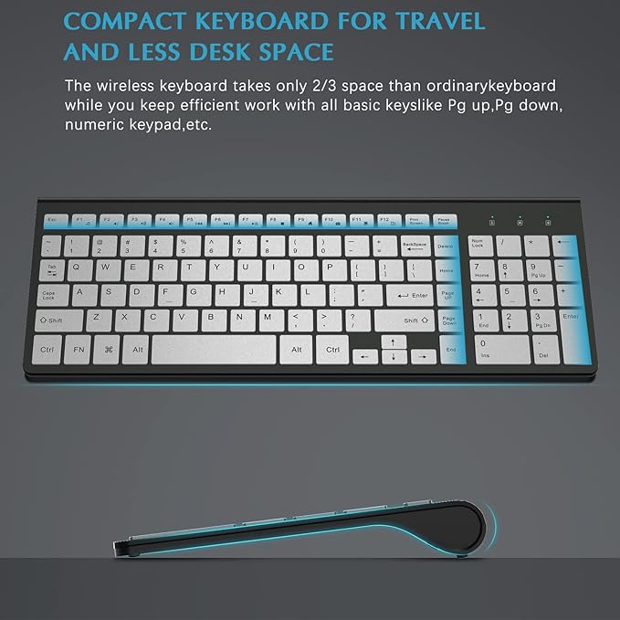 - Slim and Portable Design: With its ultra-thin and compact design, the wireless keyboard and mouse combo helps save space on your desk. It is highly portable, making it ideal for business travel, home use, office settings, libraries, and other public occasions.