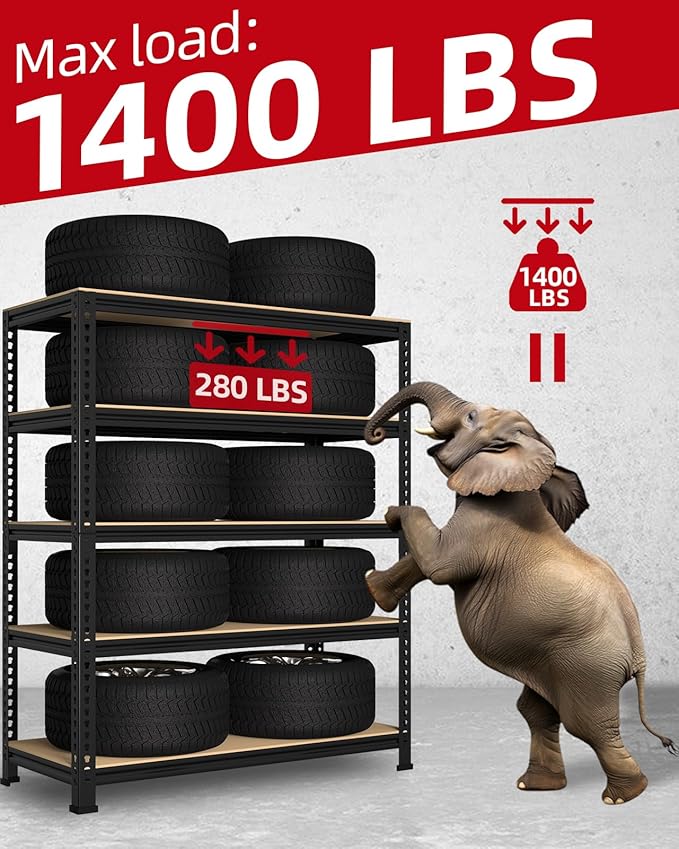 - 【 HEAVY DUTY & LONG-LASTING】: This 5-tier garage shelving is made of high-quality 0.3" thick MDF boards and heavy duty galvanized metal frame, sturdy and enduring. The metal frame is covered with premium powder coating to give it a smooth surface. Each shelf holds up to 280 lbs, 5 tier shelves' total max load weight is 1400 lbs