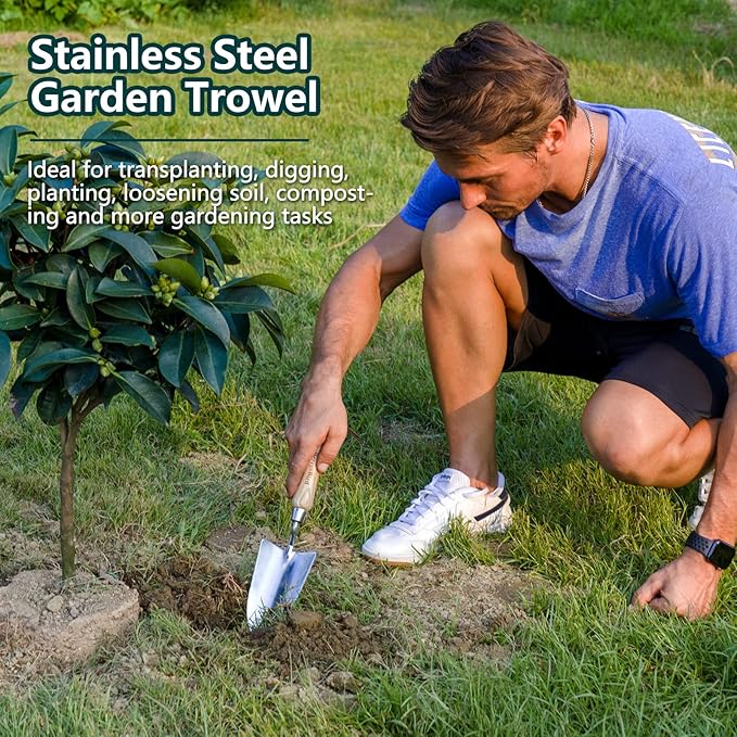 Berry&Bird Garden Tool Set 3 Pieces Stainless Steel Heavy Duty Gardening Kit Includes Hand Trowel, Hand Cultivator and Hand Fork with Wood Handle for Weeding Transplanting Digging, Ideal Garden Gifts