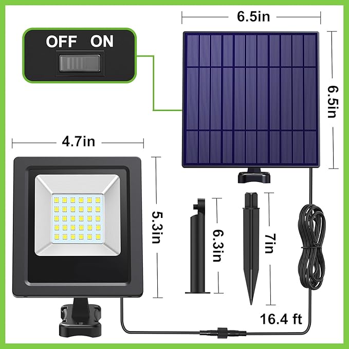 - 【Easy Installation】 - There is a 16.4ft connection wire between the solar panel and the solar flood light, with the solar panel installed in an area with sunlight, and the light installed wherever you need it. Make sure the lamp and solar panel are installed securely and, in a position to maximize exposure to sunlight during the day whilst avoiding artificial light sources at night. Insufficient charging will seriously affect the brightness and lighting durations.