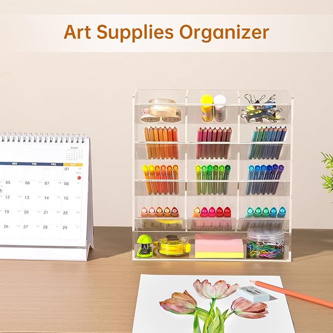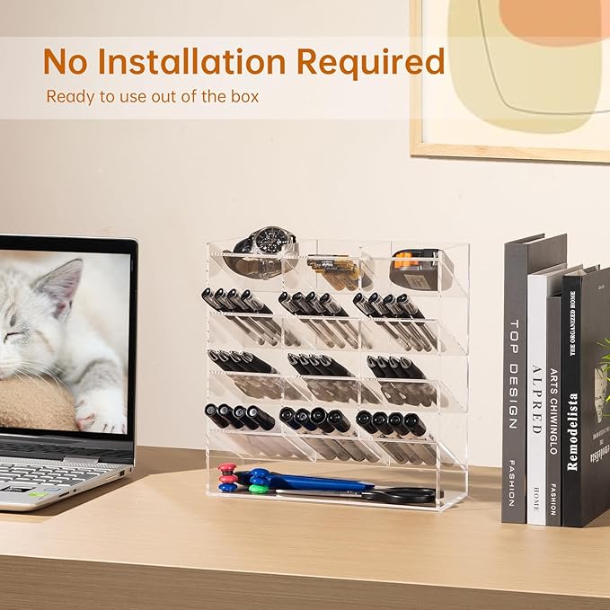 - 【SORTED & ACCESSIBLE】– Designed with 13 compartments and an inclined structure, this pen holder makes it easy to sort items by color or type for quick access. The clear acrylic allows instant visibility, making retrieval and return effortless while keeping your workspace clutter-free.