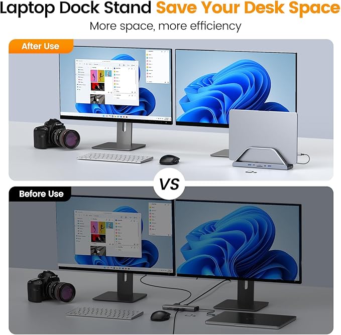 - Universal Compatibility Laptop Stand Docking Station: The universal docking station dual monitor is an ideal docking station stand for most full-function USB C or Windows or macOS laptops, such as Dell Latitude 7280/5580, Dell XPS 13 9380/9370, HP Elitebook 840 G5, HP Spectre X, Lenovo Yoga C930, ThinkPad, Surface Pro 8, Surface Book, Acer, Asus Ling Yao 3, Samsung Galaxy, Note 8/9/10, Mac Mini M1/M2/M3/M4, M2/M4 Pro, Retina Intel chip, MacBook Pro/Air 2018-2023, even on M1/M2/M3/M4 MacBook Pro/Air. You can consult us for more detailed compatibility information before purchasing
