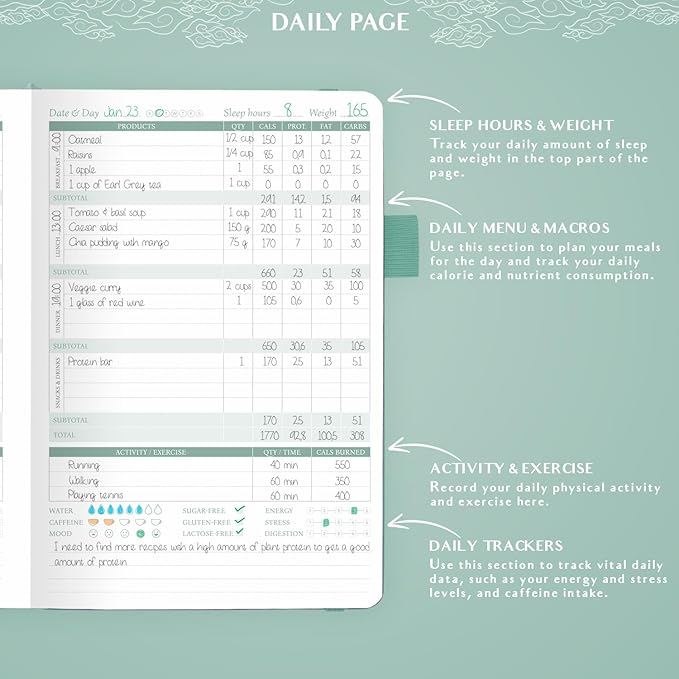 - LEARN TO DEVELOP NEW HEALTHY HABITS: This food planner lasts six months, so you will have plenty of time to plan and track your wellbeing routine. The planner has sections that will help you keep an eye on vital everyday wellness data. Create balanced and nutritious menus, track your daily physical activity, weight, and body measurements, and make sure you are paying equal attention to all areas of your well-being.