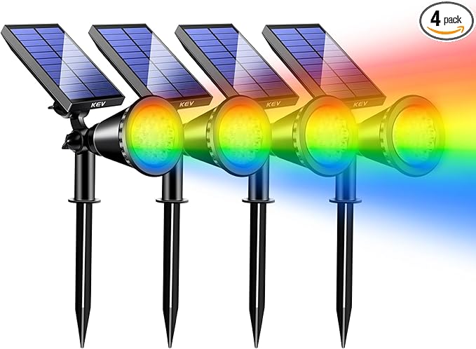 - 【Super Bright &8 Lighting Modes】Equipped with a wide solar panel,KEV 18 LED solar spot lights can provide up to 800 Lumens to light up your entire yard.The color changing led lights provide various color selections in both dynamic and static status including 1 auto changing color & 7 fixed colors.The upgraded large capacity 2200mAh battrey allows it can work continuously for 6-10 hours.