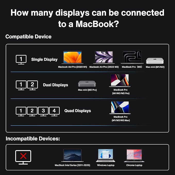 - 【Quad 6K@60Hz Displays】Only the 2021/2023 MacBook Pro series with M1/M2 Max chips supports quad extended displays. The 2021/2023 MacBook Pro series with M1/M2 Pro chips only supports dual 6K@60Hz displays. The 2020/2022 Mac series with M1/M2 chips only supports a single 6K@60Hz extended display
