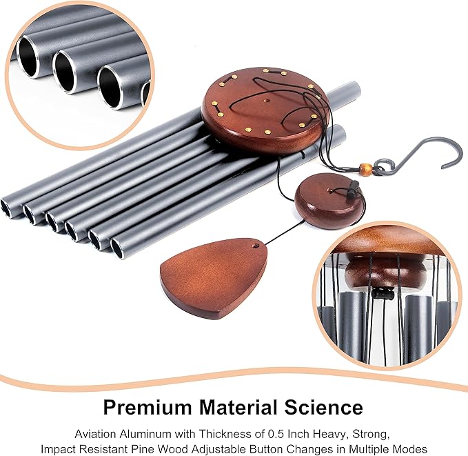 - 🎵[Large Wind Chimes Size]: The windchime is made of premium aluminum pipe and pine. The total length of the wind chimes from the top's S-shaped hook to the bottom's catcher is 37" Among them, 6 classic blue gray anodized aluminum tubes have excellent corrosion resistance and wear resistance, and the length ranges from 8.7" to 12.6". The wood is made of wear-resistant and non-cracking pine.