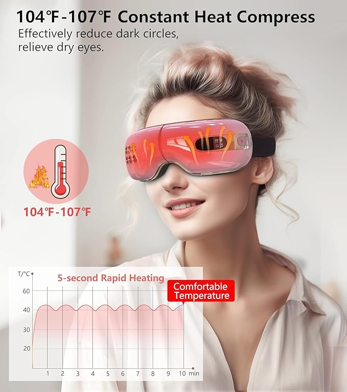 - 【Comfort Heated Compress】Constant heat compress of 104℉±1.8℉ helps reduce irritation and headaches due to eye fatigue, while stimulating blood circulation and relieving dark circles.