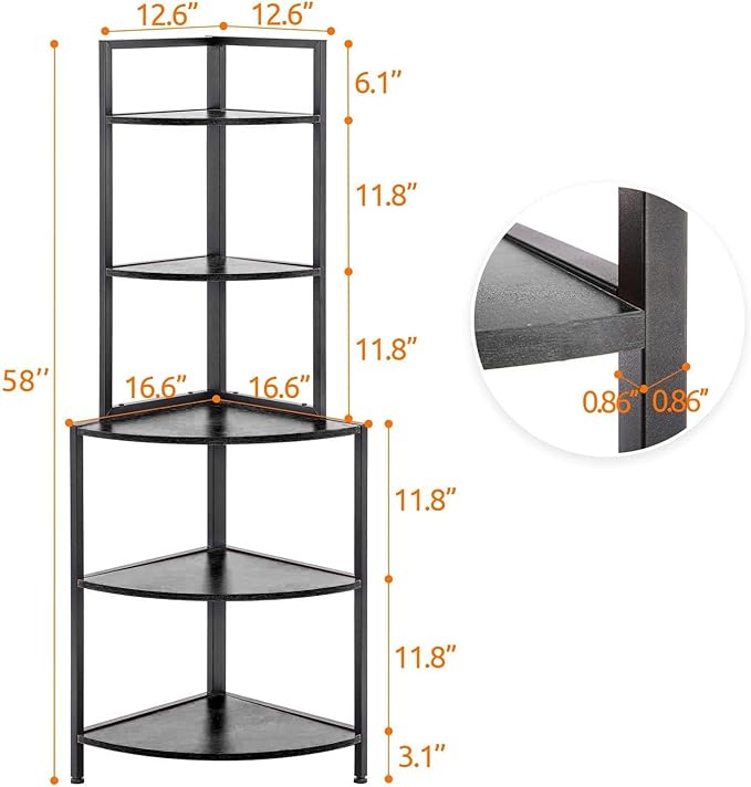 - Reliable Material】Made of high grade particle board(not solid wood) and studry metal frame, which ensures the stability of the corner bookcase and its use for many years.Dimensions: top part 12.6" W X 12.6" D X 30" H, bottom part 16.6" W X 16.6" D X 27" H, total height: 57"
