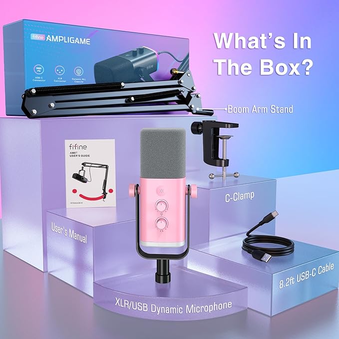 FIFINE XLR Gaming Microphone USB, PC Dynamic Microphone Kit for Vocal, Recording, Podcast, Streaming RGB Mic with Headphone Jack, Mute Button, Boom Arm Stand for Computer/Mixer-AmpliGame AM8T Pink