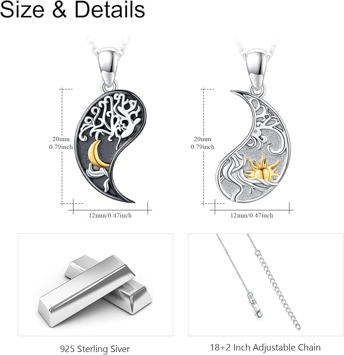 - ๐"Matching Couples Necklaces" - Made of 925 sterling silver, hypoallergenic, anti-tarnish, lead-free, and cadmium-free. The sun, moon, and tree of life are handcrafted and embellished with plating for a delicate and romantic look.