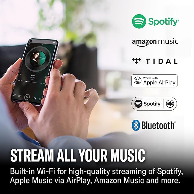 - STREAM ALL YOUR MUSIC: Built-in Wi-Fi gives you stable, high-quality streaming via Spotify Connect, AirPlay 2 for Apple Music and more. Enable Alexa for streaming Amazon Music with voice control. Use Bluetooth to stream anything you want.