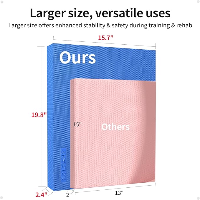 - [Extra Larger Size&Versatile Use]19.8*15.7*2.4inch.Larger balance pads provide a larger support area, making people more stable and safe during training or rehabilitation. It can also better train body muscle control and balance, enhancing body stability and coordination. Large balance pad usually has better anti-slip performance, offering better support and protection. They are suitable for users of different heights and body types, better meeting their needs