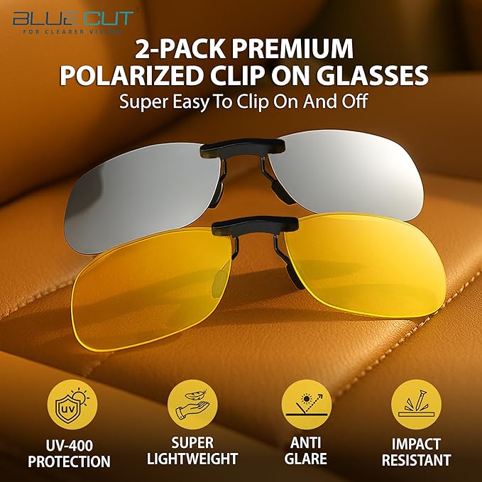 - ☑️GET THESE 2 PACKS AND YOU WILL BE COVERED DAY AND NIGHT - BLUE CUT Night vision driving sunglasses fits on top of regular prescription sunglasses! You can put them over most large prescription glasses and take them off instantly. Clip On polarized sunglasses comes with UV-400 UV protection lenses makes them perfect for driving, fishing and other sports and outdoor activities.