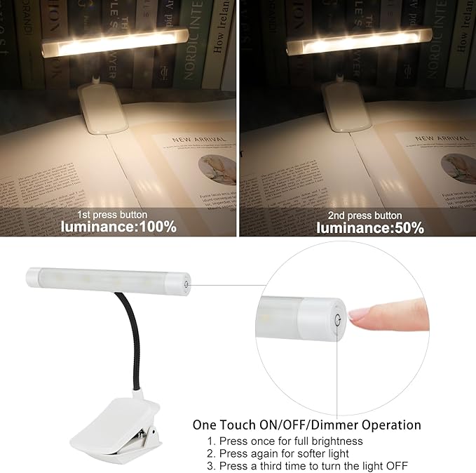 - Two Lighting Modes: Our book light is thoughtfully designed to meet your preferences. Its dimmable reading light suits various activities like reading, and the softer light is gentle on sensitive eyes without disturbing your partner.
