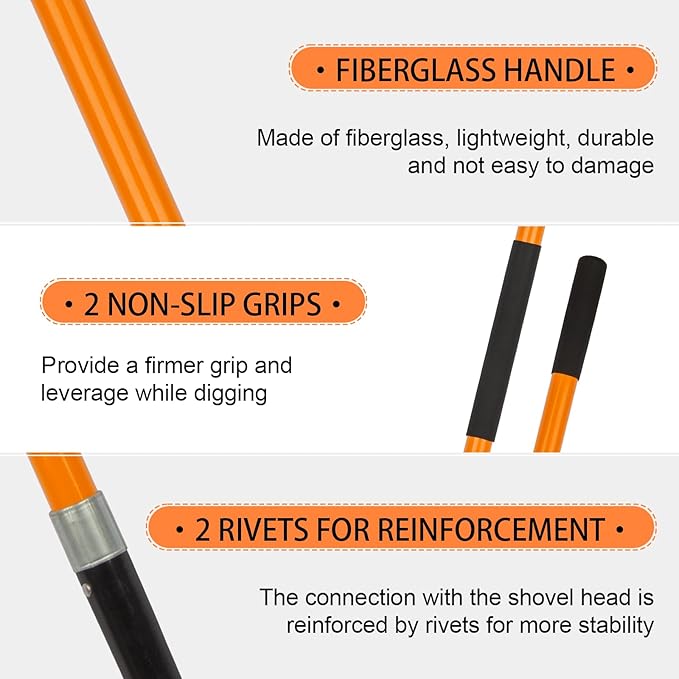 - Non-Slip Handle: The digging shovel handle is made of fiberglass for lightweight and durability, with 2 non-slip zones on the handle to provide a firmer grip and leverage while digging.