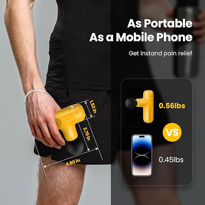- 【Compact & Portable】Weighing only 0.56 lbs and sized just at 4.8 x 2.8 x 1.5 inches,this massage gun mini is designed to fit effortlessly into your pocket, gym bag, or luggage. Its ultra-lightweight and ergonomic build offers maximum portability without sacrificing power—perfect for athletes, travelers, and busy professionals. HEYCHY allows you to relax anytime, anywhere.
