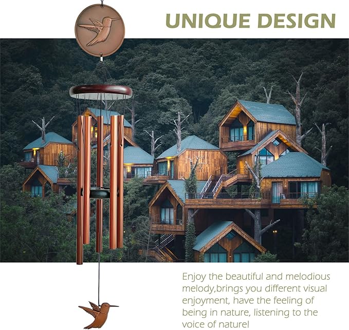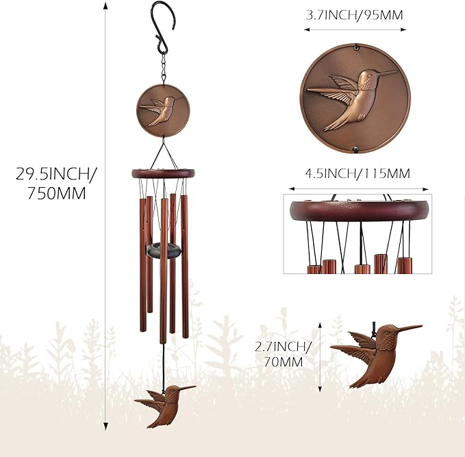 - ♪【Quality Materials】The total length of the wind chime is 32",5 aluminum tubes,which range in length from 8.85" to 10.82".Classic red copper anodized aluminum tubes,A zinc-alloy dome with a hummingbird motif,round knockers,and round zinc-alloy hummingbird pendants are more resistant to corrosion, weather,and rust than wood materials.Strong aluminum S hook, black high density nylon rope,safe and reliable.
