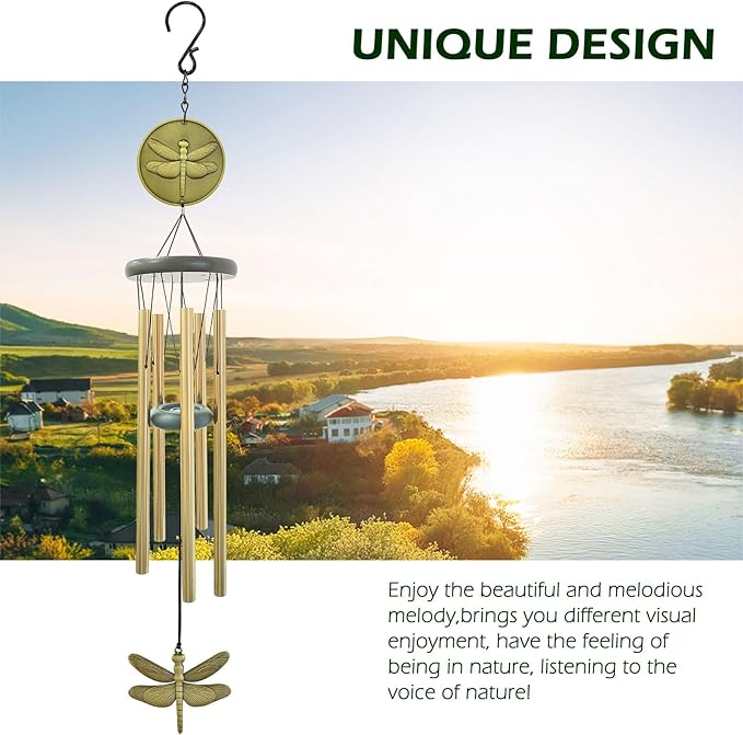 - ♪【Quality Materials】The total length of the wind chime is 32",5 aluminum tubes,which range in length from 8.85" to 10.82".Classic Bronze anodized aluminum tubes,A zinc-alloy dome with a Dragonfly motif,round knockers,and round zinc-alloy Dragonfly pendants are more resistant to corrosion, weather,and rust than wood materials.Strong aluminum S hook,black high density nylon rope,safe and reliable.