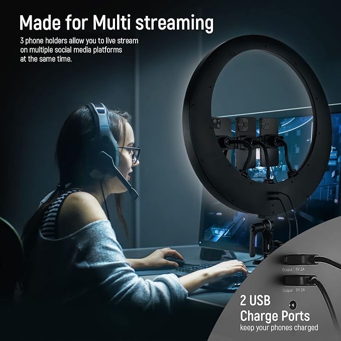 - 【Versatile Multi Device Support】 RP19H lighting kit provides convenience and adaptability across multiple devices. Featuring 3 cold shoe mounts and 3 phone holders compatible with iPhone, other cell phones and DSLR cameras, record or stream on multiple platforms simultaneously, ideal for streamers, influencers, makeup artists, and other social media practitioners. The 2 USB charging ports (5V 2A) keep your smartphones powered during live streaming, podcasts, photoshoots, and other videography