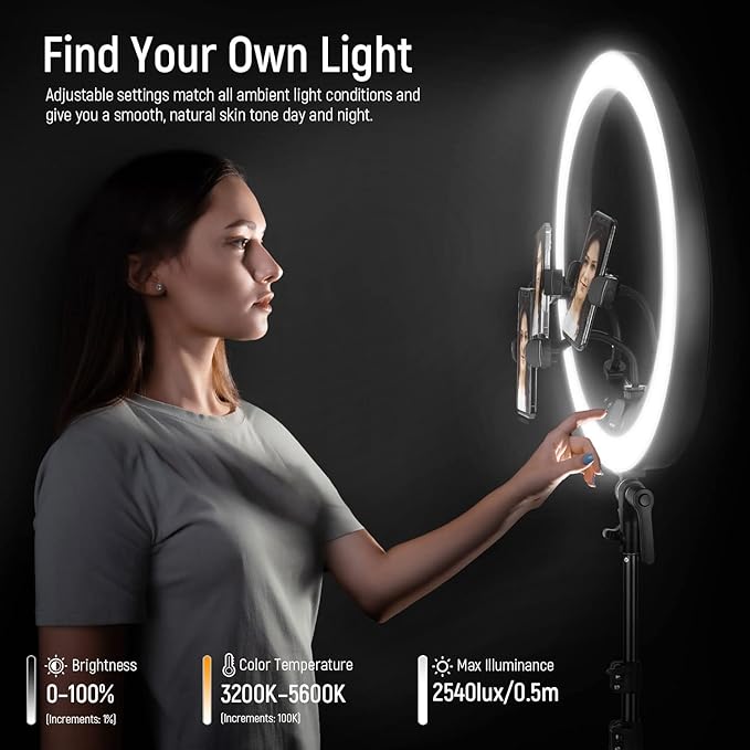 - 【Professional Lighting Made Easy】 This big ring light provides soft light, exceptional brightness (0%-100% adjustable, 1% fine tuning), and a wide color temperature range (3200K-5600K), taking your livestreaming to the next level. The sturdy aluminum alloy light tripod with circle light offers adjustable height (31.5"-70.87") to make your photography accessories setup complete