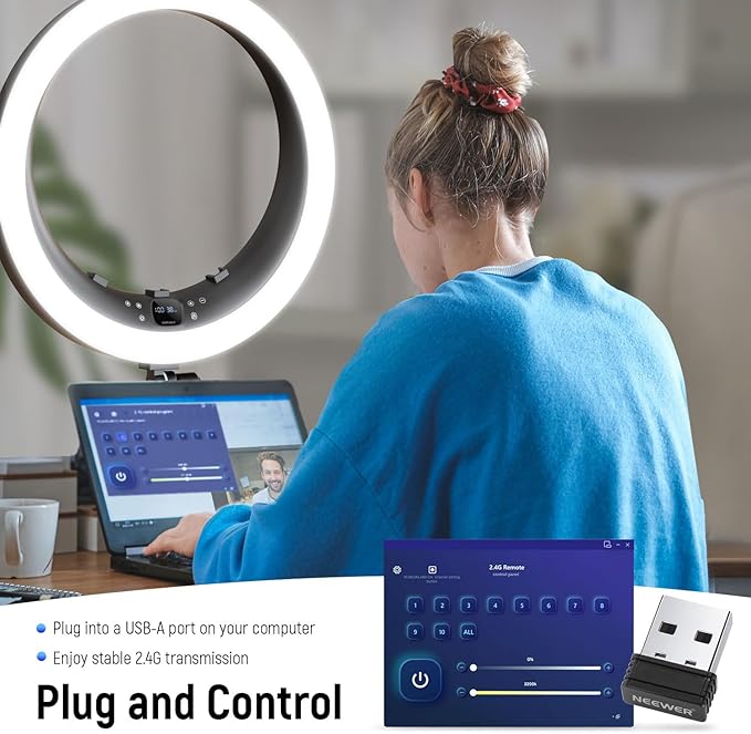 - 【USB Adapter for PC & Mac Control】 Transform your desktop or laptop into a remote for the portable RP19H standing ring light with the USB adapter. Enjoy stable 2.4G transmission (up to 66'/20m range) by plugging the adapter into a USB A port and downloading the "NEEWER Live 2.4G" app. Easily adjust settings and select channels (1-10) with the app, channel "ALL" for collective control of multiple NEEWER 2.4G lights (GL1 PRO, T140, NL660, CL124, etc.)