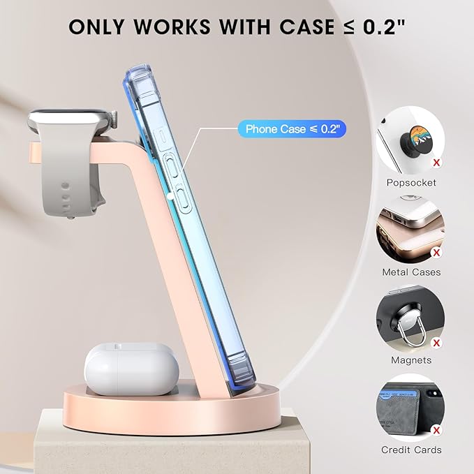 - 3 in 1 Wireless Charging Station : Designed for users of Apple products, wireless charging allows you to charge for iPhone and Apple watch & Airpods simultaneously with just one cable. With a built-in wide-range induction coil and wireless charger technology, it brings you an easy and convenient charging experience without the hassle of cluttered wires. Note: Please do not wear a case thicker than 5mm(0.2").