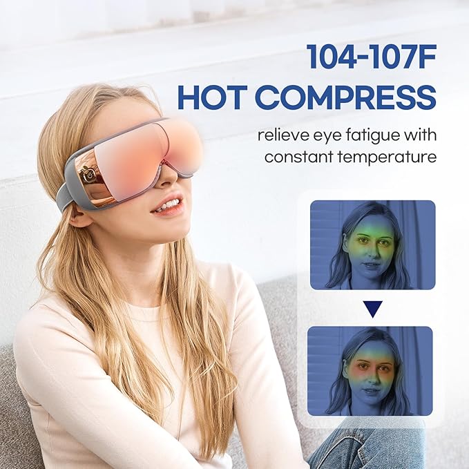 - 【Comfortable Heating Massage】HubiCare eye massager built-in heating pads provide a comfortable temperature between 104 and 107 degrees Fahrenheit(40℃-42℃), better for relaxing eye puffiness, dry eyes, etc. A hot compress can regulate the metabolism of the eyes, more effectively improve symptoms such as dry eyes, and reduce dark circles. Note 1: We do not recommend customers use eye machines if they have undergone eye operation, retina condition, cataract, glaucoma, etc.