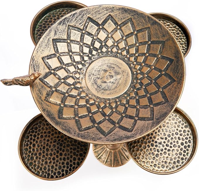 - 🦜MATERIAL:The five-in-one bird bath tray is the first in the market,It is carefully handcrafted by blacksmiths,The base of the bird bath is cast iron and is heavy enough to withstand inclement weather without tipping over, and the lightweight metal pot is made of durable metal material that After multi-layer powder coating treatment, it is more rust-proof and durable, and it is easy to clean,has a bronzed, antique finish.