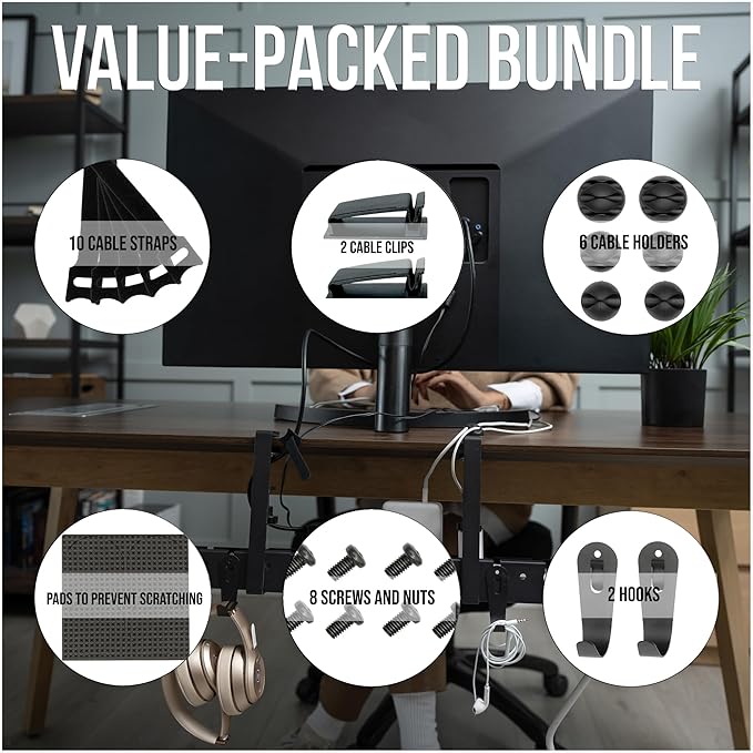 - Includes Numerous Practical Accessories: Our non-slip cord and cable management desk tray isn't just a one-trick pony; It comes with a suite of handy organizing accessories of two Hanging Hooks, ten Cable Ties, two Cable Clips, and six Cable Holders