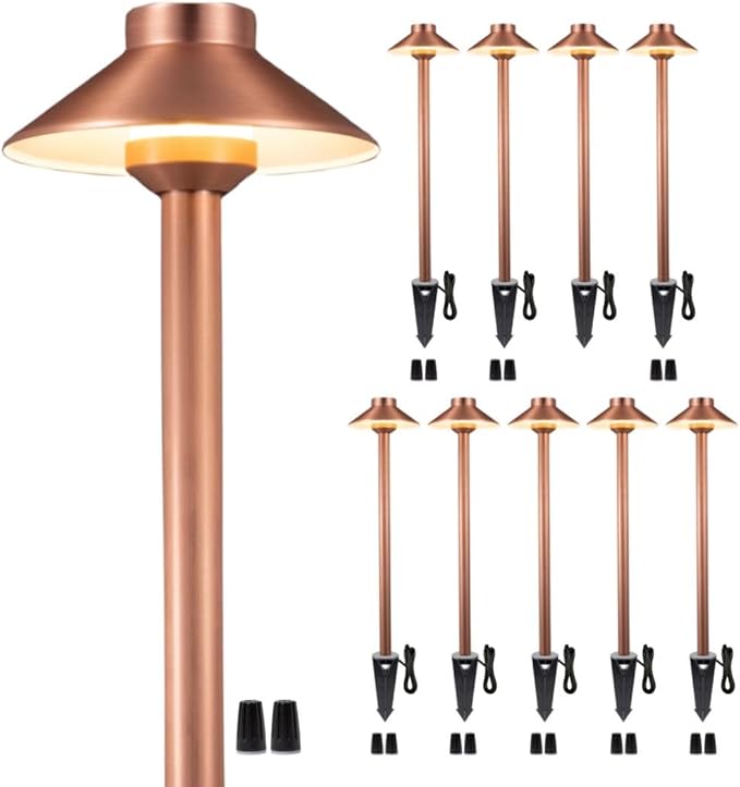 LED Copper Brass Landscape Lights(Hat) Waterproof Outdoor 12V Low Voltage Path Lights for Sideway Garden with Ground Stake Without G4 Bulb(10 Pack)