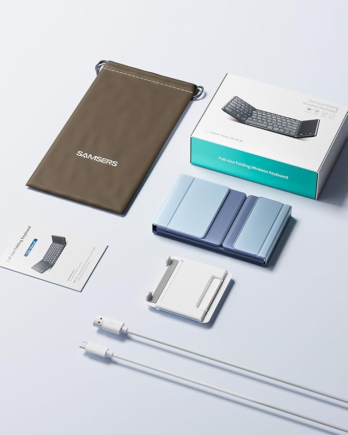 - 【Little Things & Big Convenience】 Samsers portable folding keyboard, only 9.3 ounces. Palm-sized keyboard can be folded up magnetically and put in your briefcase without taking up much space. Maximum convenience for you with minimum weight and size! Comes with a phone stand and a velvet storage bag, the perfect companion for a folding keyboard. Not just a keyboard, but a travel solution!