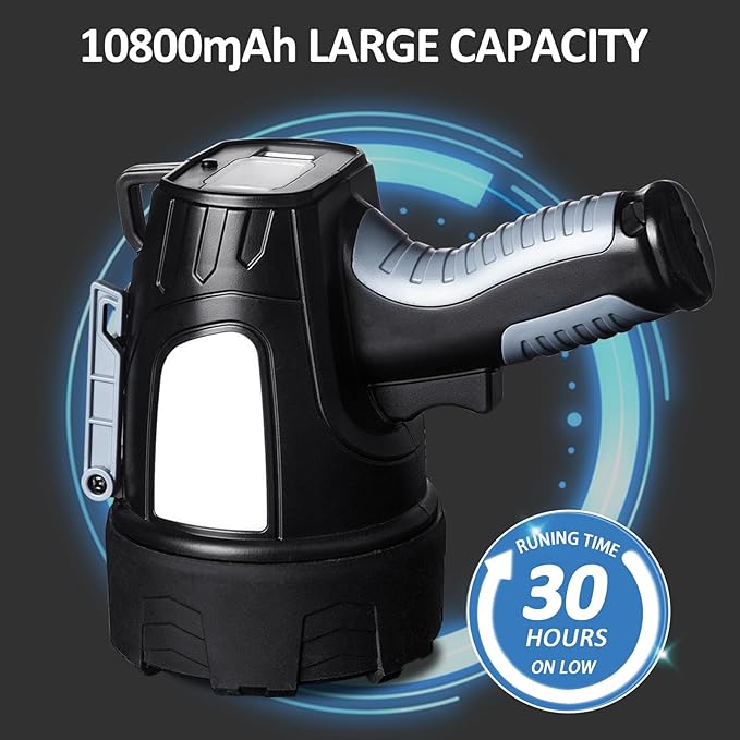 - 【10800mAĥ Rechargeable & Power Display】 - High lumen spotlight with built-in 10800mAĥ rechargeable ΒATTERY, 150% longer life span compared to other spotlights. The rechargeable spotlight features USB input and output ports, 4 hours of fast charging, and tested to last 15,000 times. It is also very convenient to use as a mobile power supply. The searchlight has power display (25%, 50%, 75%, 100%), allowing you to see it clearly at a glance.