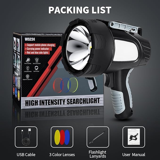 - 【4 Colors Filters & Foldable Tripod】 - In addition to the standard white light, the handheld spotlight main light also comes with (red-blue-yellow) 3 color filters that are replaceable and can project different colors to meet different needs. Lighting environment requirements. Built-in foldable tripod allows for hands-free boating, camping, and car maintenance. The included lanyard makes it easy to carry the spotlight.