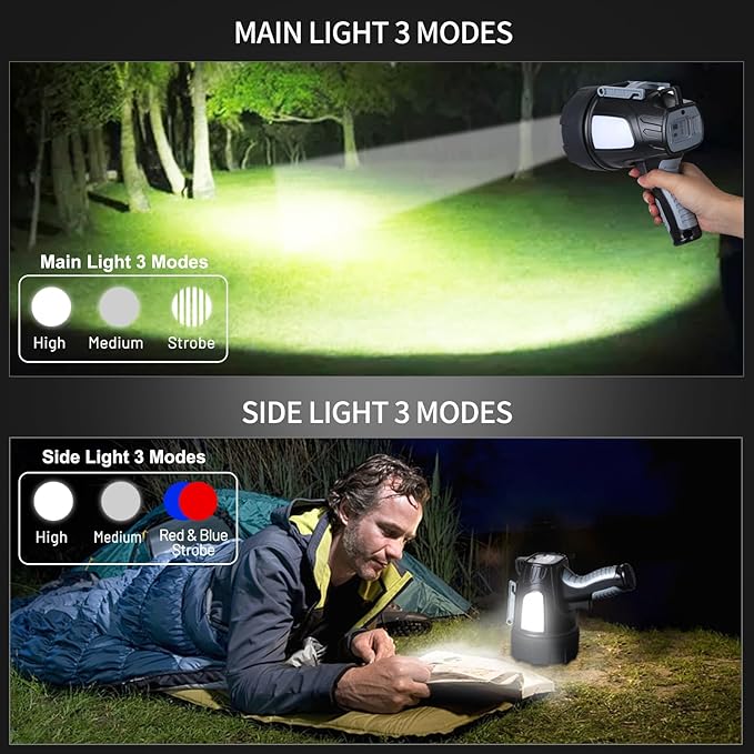 - 【Side Light 3 Modes】 - Multifunctional spotlight with Dual Side Light 3 Modes: Side Light (High - Low - Security Warning Light). Red & blue strobe lights (only works on one side) have a help-seeking function. Run time is up to 30 hours. Upgraded handheld soft curved handle, comfortable. Two-way button design, easy to use, ideal as a gift for family, friends, and holidays.