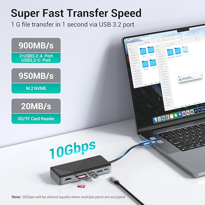 - NVMe SSD Docking Station Combination: This usb c hub has built-in a m.2 ssd slot which support NVMe M Key and NGFF SATA B&M Key ssds with size of 2230/2242/2260/2280. This usb c dock also includes a variety of interfaces for optimal productivity. These ports include 1xPD 100 watts input, 2xUSB 3.2 Gen2 10 Gbps, 1xType-C 10 Gbps, 1xHDMI2.0 4K 60Hz, 1xSD/TF2.0 5 Gbps(Simultaneous reading is not supported). NO network port