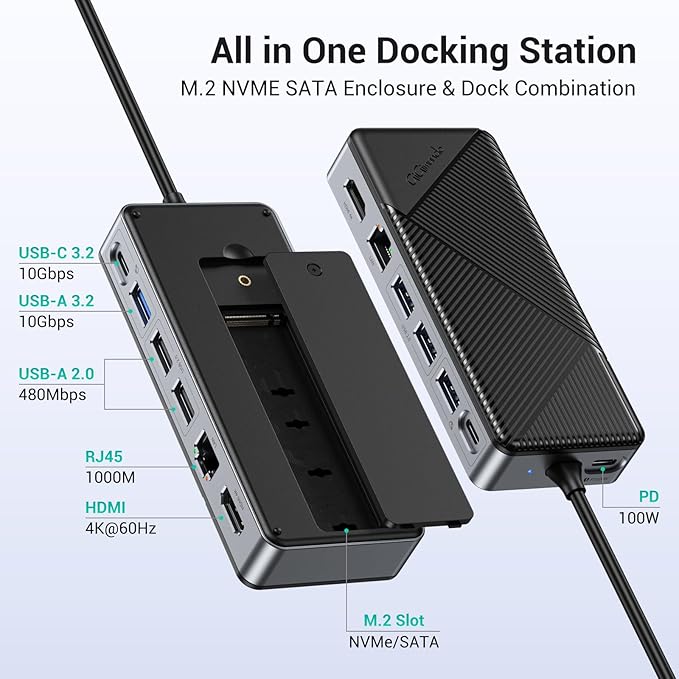 GiGimundo GM28PR M.2 NVMe SSD Docking Station - 10Gbps Multi Ports USB-C Hub, PD100W, HDMI 4K 60Hz, RJ45 Gigabit Ethernet, M.2 Dock for Laptop Mac, Black