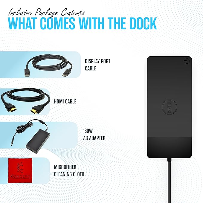 - [Package Includes] - Dell Dock Station WD19TB, Original Dell 180, 1x HDMI Cable, 1x Displayport Cable, Microfiber Cleaning Cloth.