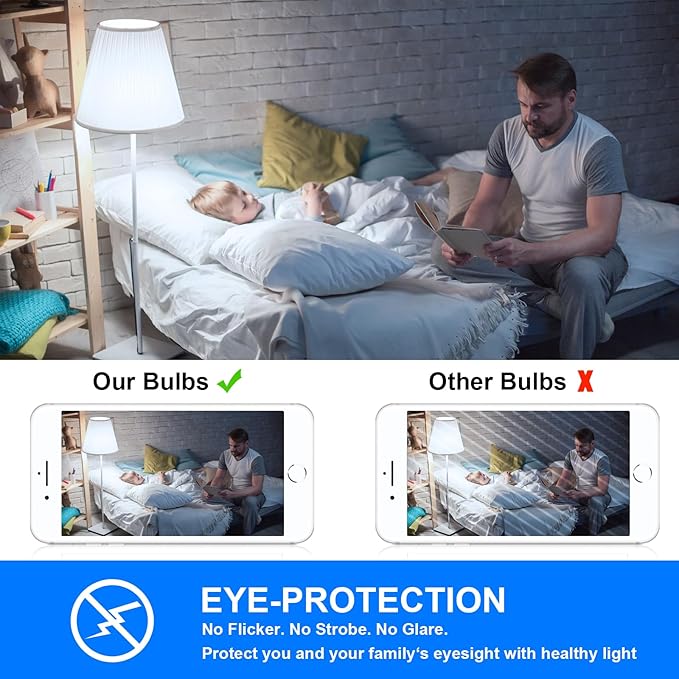 - 60W Equivalent Eye-caring Light: By generating 800 lumens of light, our dimmable LED bulbs can perfectly replace 60W incandescent bulbs with only 7 watts used. Save you about 90% on the electricity bills without undermining luminance level. Besides, they give off stable light without flicking, buzzing or harsh glare, effectively protecting you and your family’s eyes