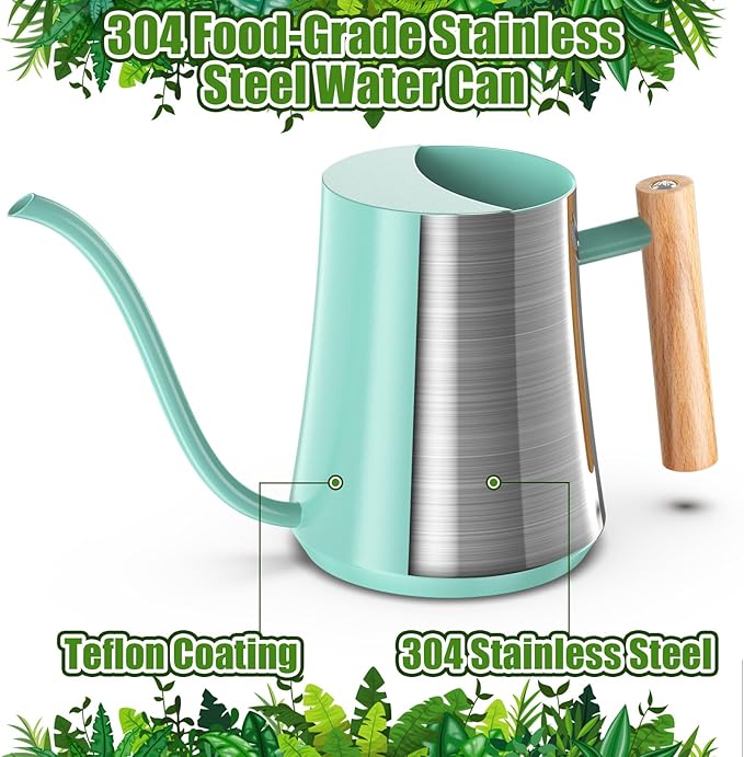 - 【COMFORTABLE WOODEN HANDLE】Our indoor watering can has a round comfortable wooden handle. It is easy to grasp and won't hurt your hands. Also, our stainless steel watering can has a built-in open-top design, which is convenient for refilling water.an exquisite and light body design, our watering pot serves as a decoration.
