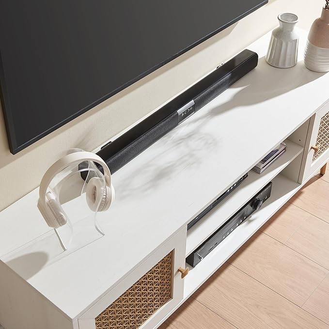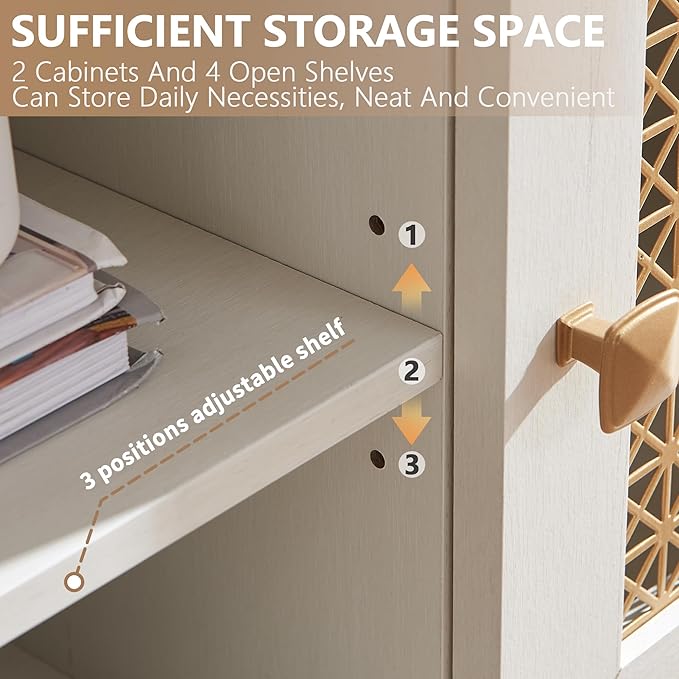 - Mid Century Design: This TV cabinet features a mid-century aesthetic with an retro wooden exterior and gold metal mesh doors decorated.Available in three colors: Rustic Oak, Black and Antique White,you can exactly choose the one as you like.Every detail was fit in well with most home decors with it unique charm
