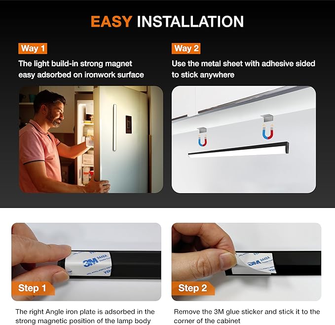 - ăEasy to Install, Wide Applicationăkitchen lights under cabinet has built-in magnetism and can be easily stuck on any iron surface, no electrician required. It also comes with a 3M adhesive right-angle metal plate, ensuring it sticks to any non-ferrous surface. Magnetic design allows LED strips to be easily removed for charging or changing positions, perfect for kitchens, bedrooms, picture, camping,closets, nurseries, counters, garages, basements, stairs, hallways, gift display cases, bedside