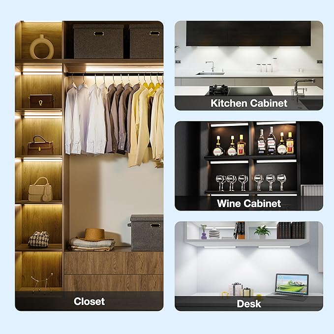 - đ[Upgraded dimmable and color-adjustable closet light]: The under-cabinet light provides three different color temperatures ((3000K / 4500K / 6000K), which can be switched through the light switch or remote control. It uses 68 energy-saving LED lights and no glare With a frosted cover, the display index of the cabinet light reaches 90, the light is even and does not hurt the eyes. In addition, unlike the fixed brightness of other products, our indoor sensor lights can be infinitely dimme